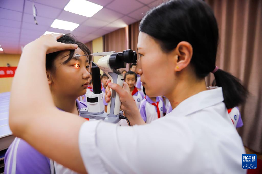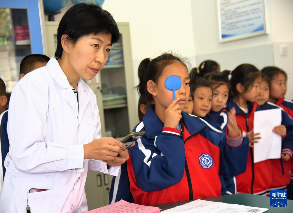 6月6日,甘肃省平凉市静宁县妇幼保健院的医务人员在南关小学为学生做眼部检查。