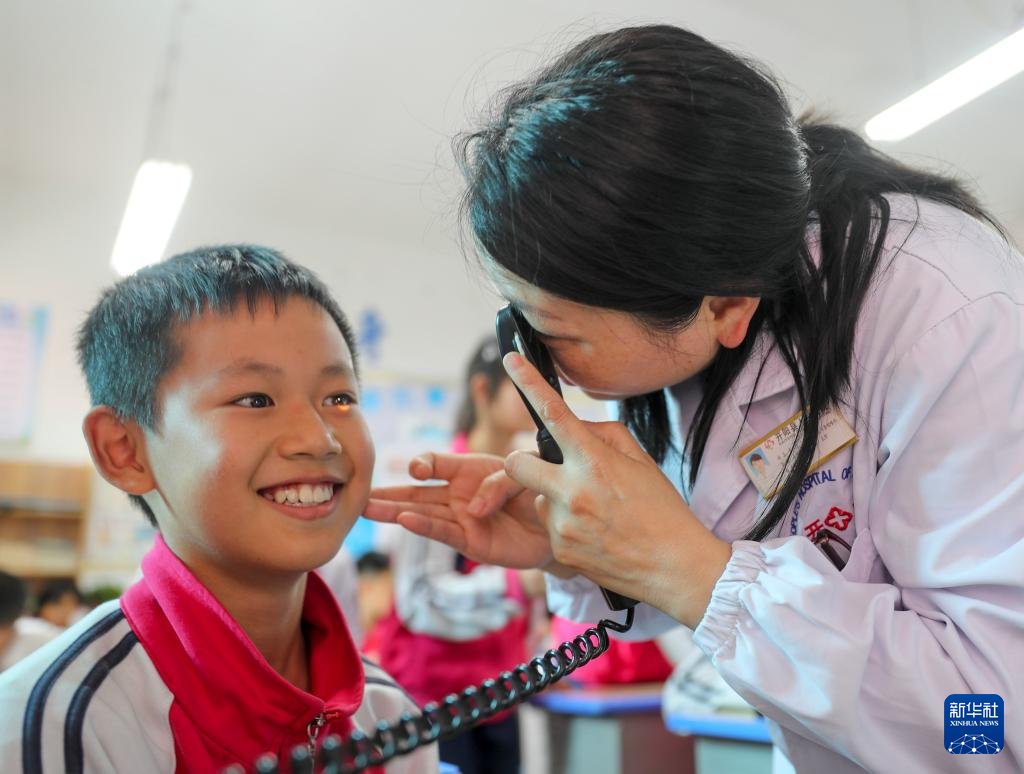 6月6日,眼科医生在贵州省开阳县第二小学给学生做眼部检查。