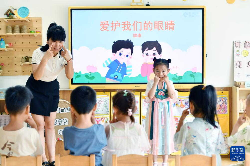 6月6日,在河北省石家庄市桥西区一幼儿园,老师带领小朋友们做眼保健操。
