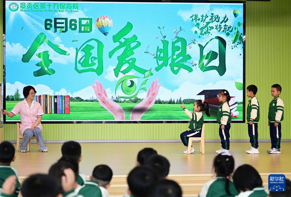 6月6日,江西省赣州市章贡区第十九保育院的小朋友在爱眼日活动上检测视力。
