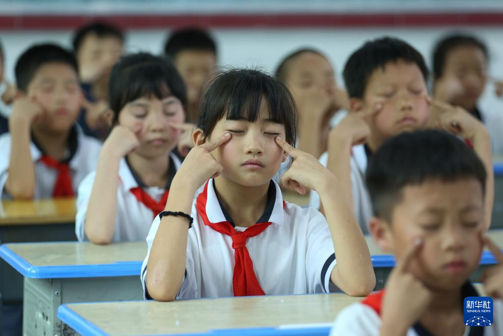 6月6日,贵州省黔南布依族苗族自治州福泉市实验学校的学生在做眼保健操。
