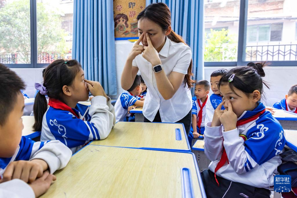 6月6日,贵州省安顺市第七小学学生在老师的指导下做眼保健操。