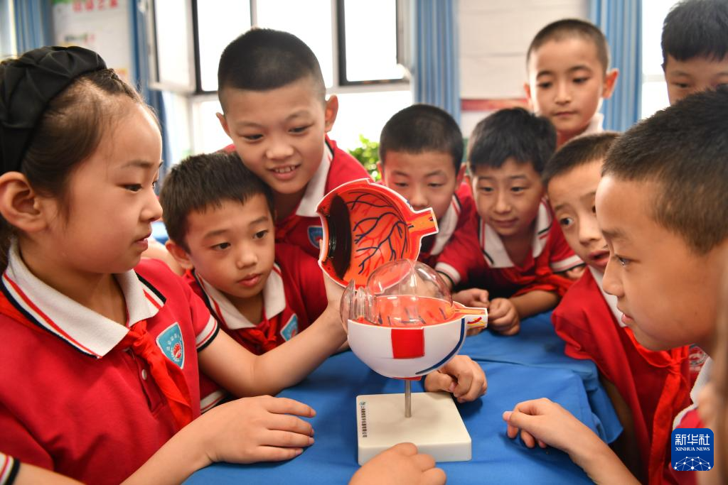 6月6日,在河北省石家庄市栾城区凌空桥路小学,学生们仔细观察眼球构造。