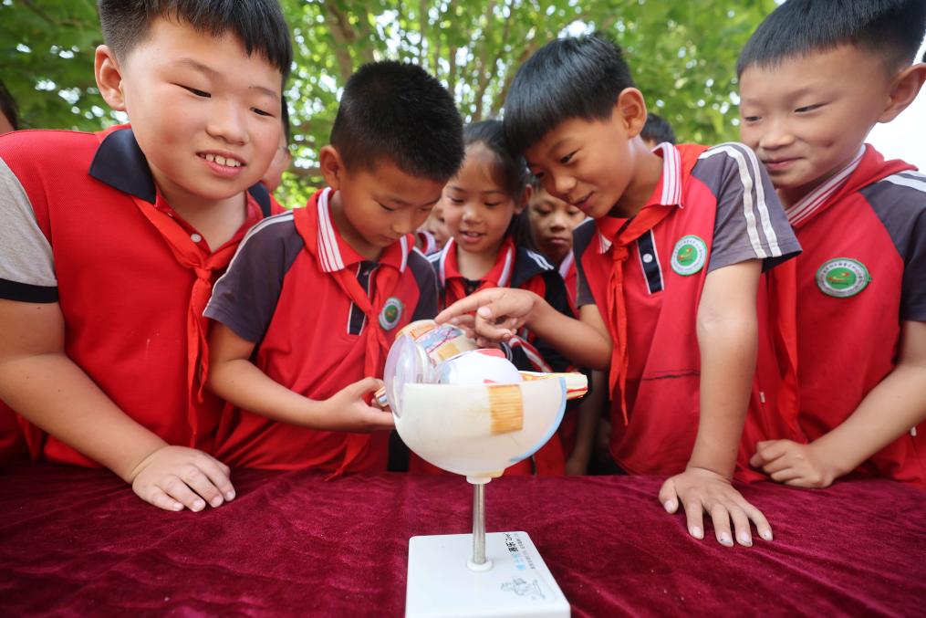 6月6日,在山东省临沂市沂南县鲁家庄中心小学,学生在观察眼球构造模型。