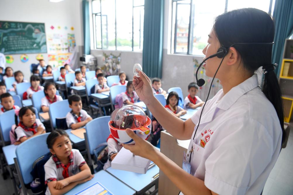 6月6日,在江苏省扬州市江都区仙女镇龙川小学,医务人员为学生讲解护眼知识。