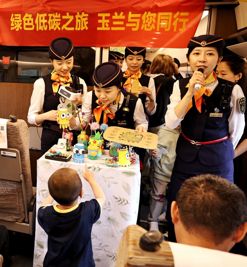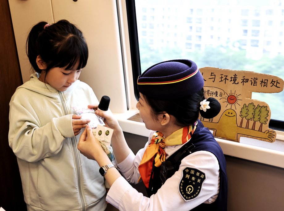 6月5日是世界环境日,当天,中国铁路广州局集团有限公司长沙客运段动二队玉兰组在G1348次上开展了一次生动特别的绿色环保主题互动活动。新华网 发
