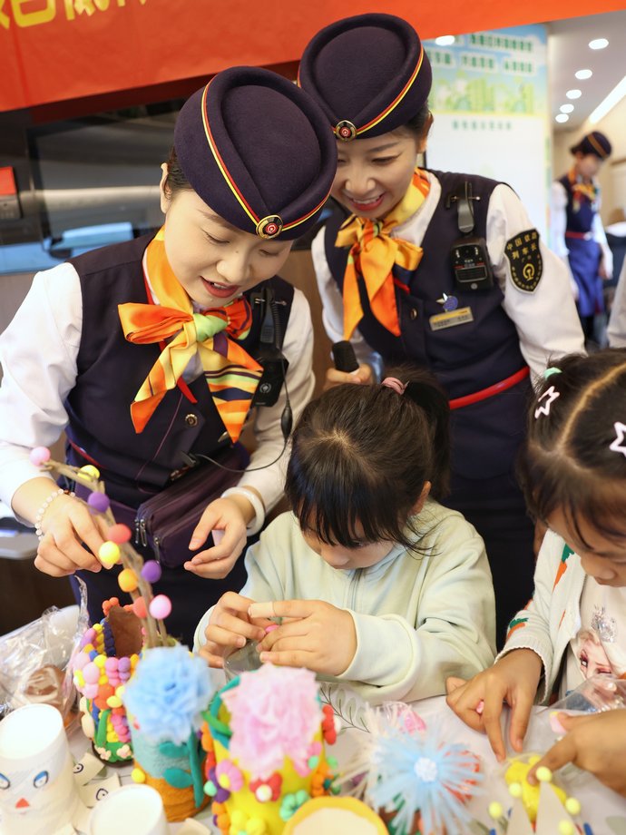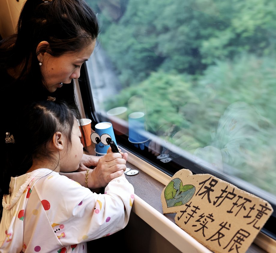 6月5日是世界环境日,当天,中国铁路广州局集团有限公司长沙客运段动二队玉兰组在G1348次上开展了一次生动特别的绿色环保主题互动活动,乘务人员与列车上的乘客和小朋友们一起,以包装盒和废旧材料制作展板和道具,普及环保知识,宣传推广生态文明发展理念,引导大家践行绿色低碳生产生活方式。新华网 发