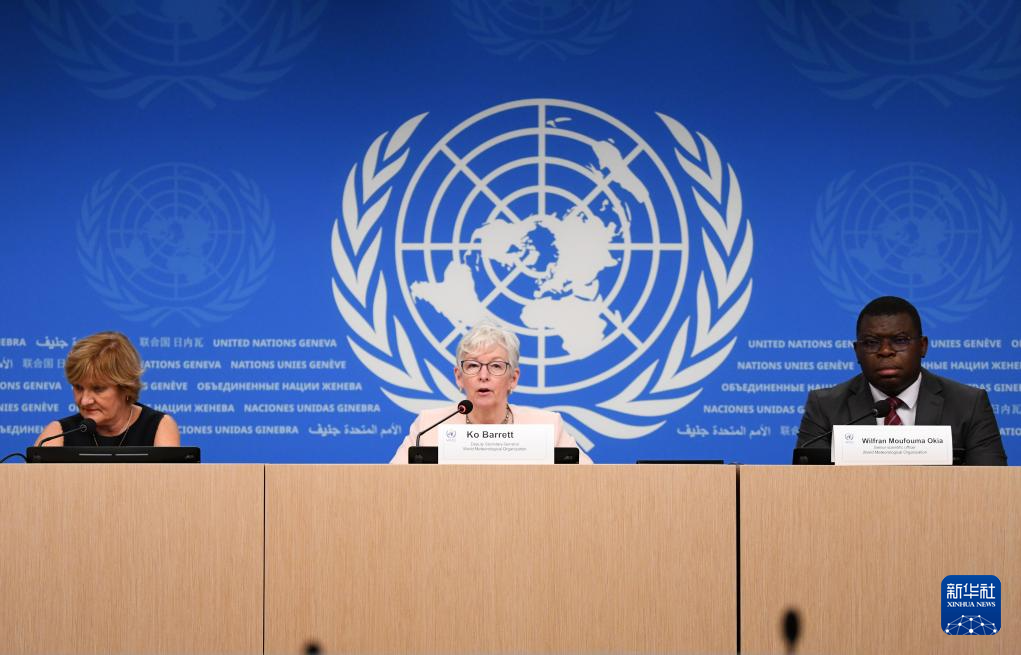 6月5日,世界气象组织副秘书长科·巴雷特(中)在瑞士日内瓦举行的新闻发布会上发言。