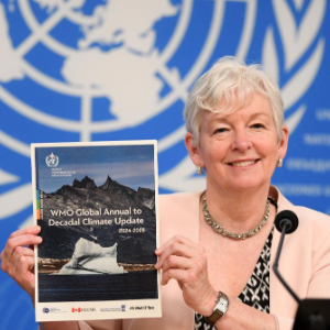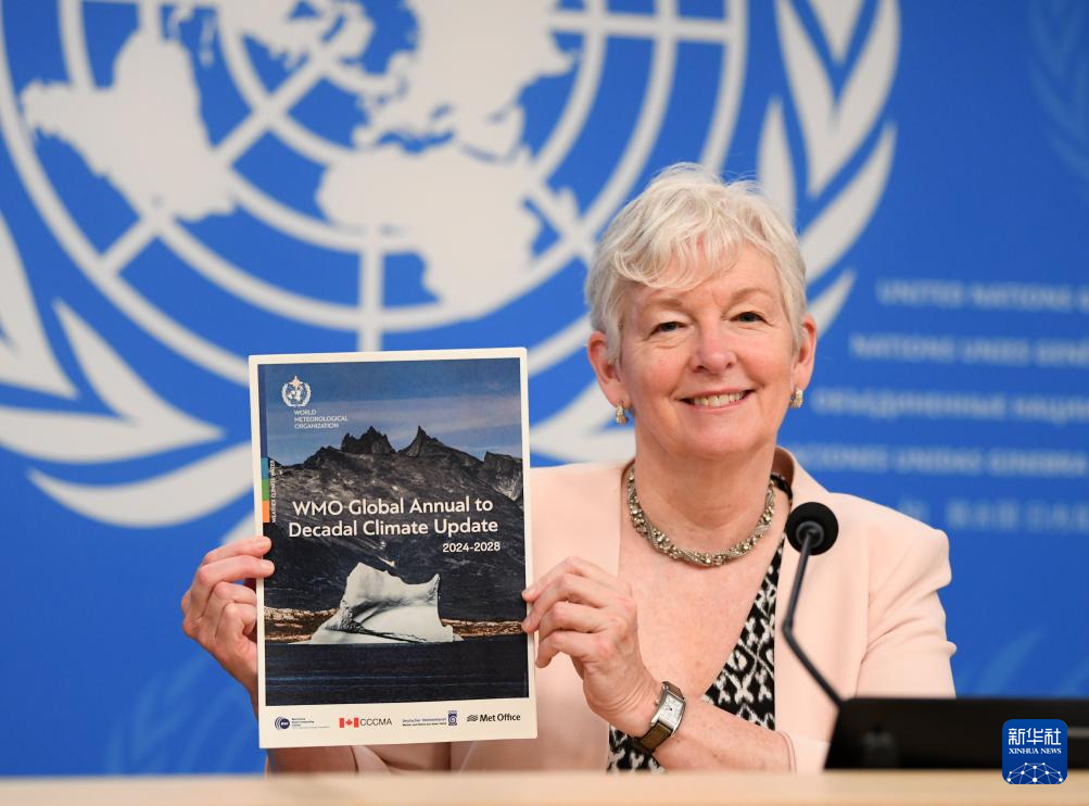 6月5日,世界气象组织副秘书长科·巴雷特在瑞士日内瓦展示《全球年际至十年际气候最近通报(2024-2028)》的报告。