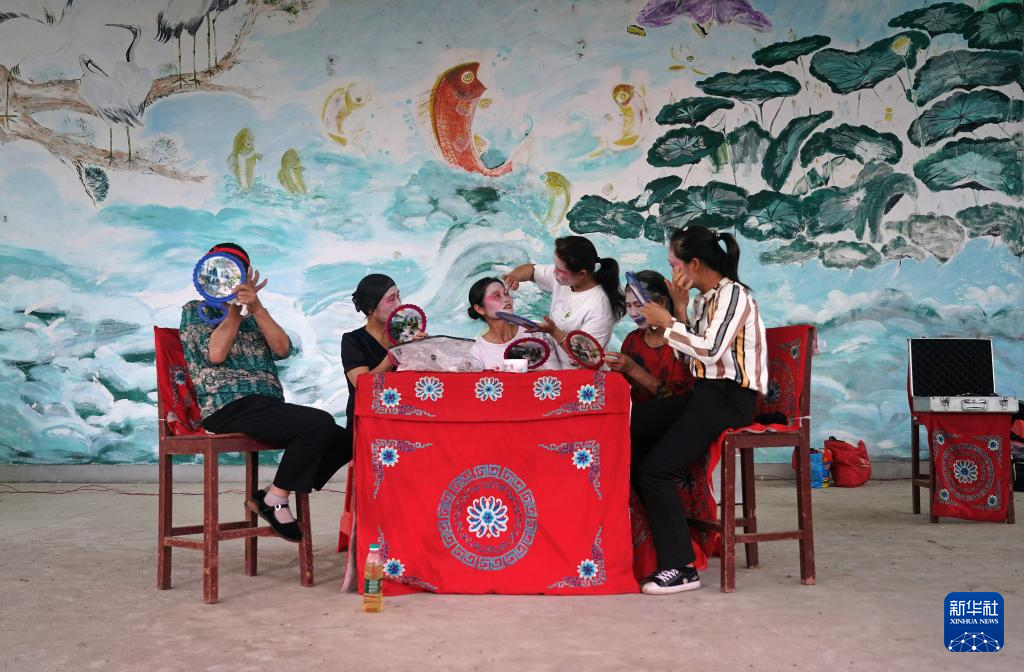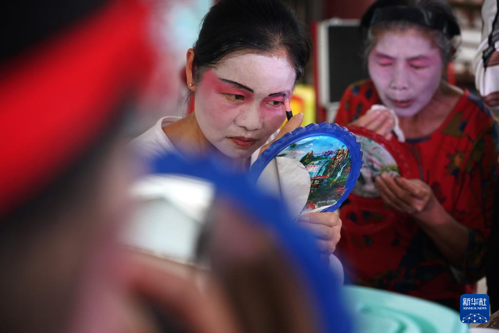 在广昌县头陂镇西港村,剧团团员在演出前化装(5月10日摄)。