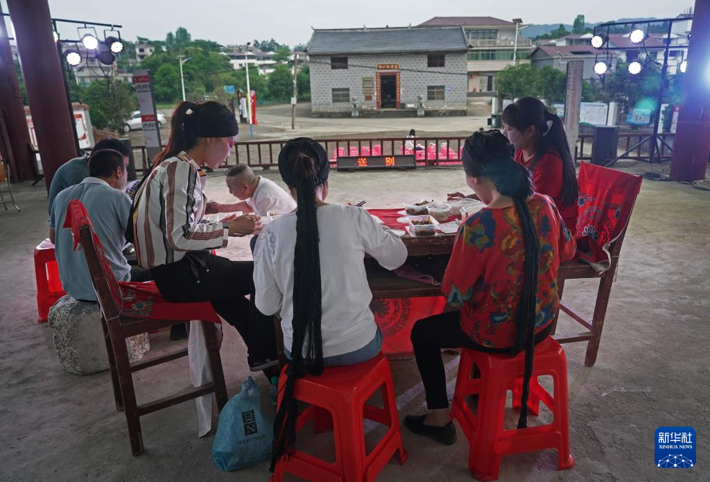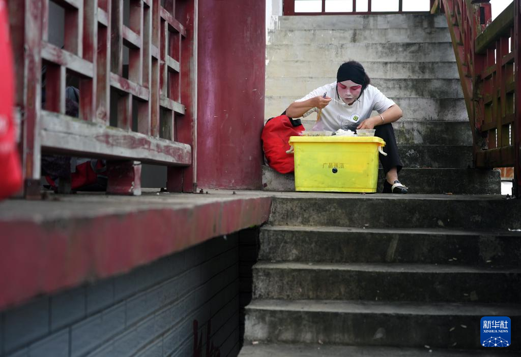 在广昌县头陂镇西港村,剧团团员在演出前吃饭(5月10日摄)。