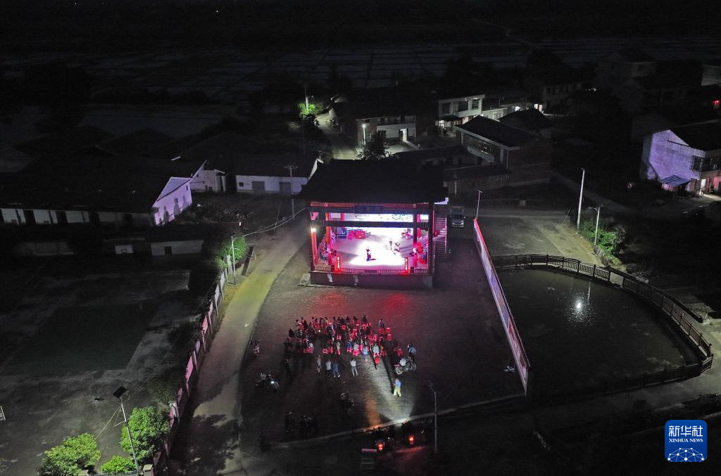 在广昌县头陂镇西港村,村民在观看孟戏演出(5月10日摄,无人机照片)。
