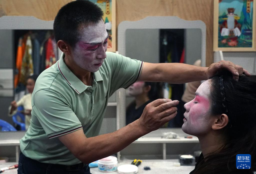 在广昌县甘竹镇的大路背孟戏剧团,李安平(左)在给戏曲爱好者化装(5月11日摄)。