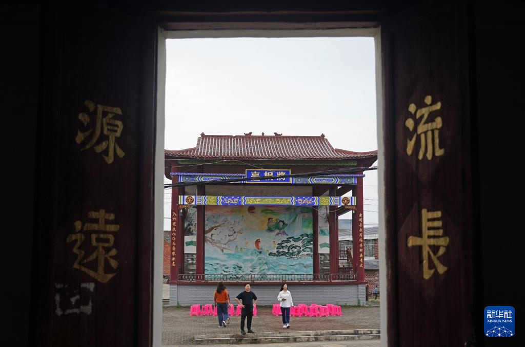 在广昌县头陂镇西港村,工作人员为晚上的孟戏演出做准备(5月10日摄)。