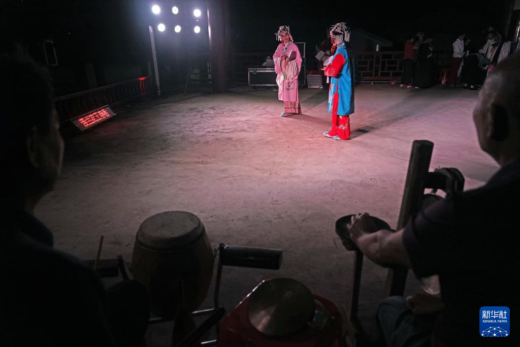 在广昌县头陂镇西港村,剧团演员为村民演出孟戏选段《送别》(5月10日摄)。