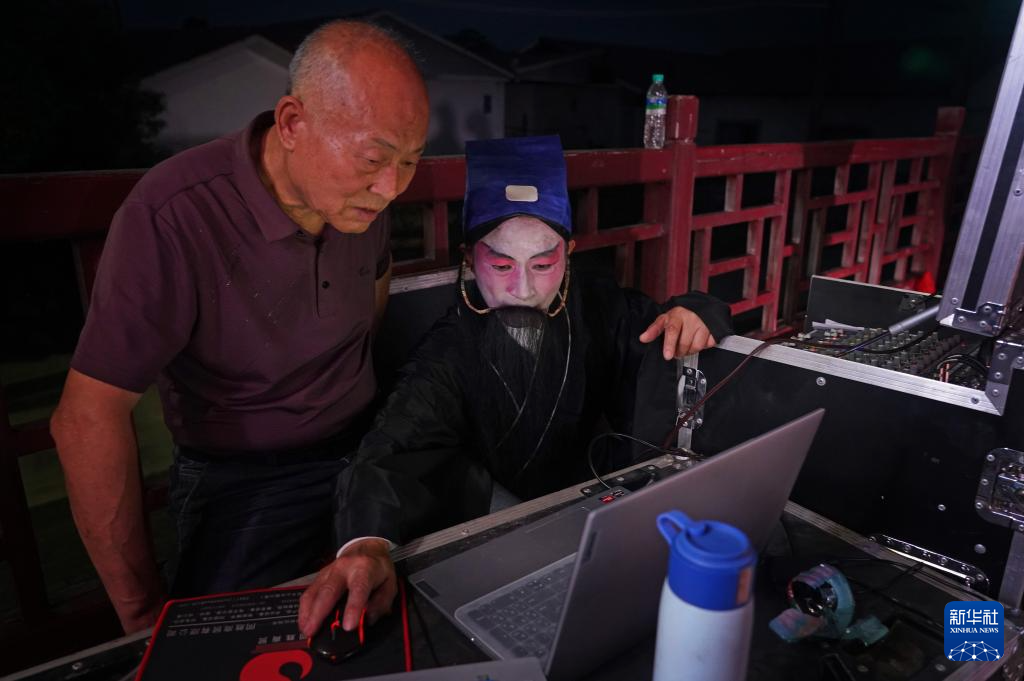 在广昌县头陂镇西港村,李安平(右)演出前调试音响(5月10日摄)。
