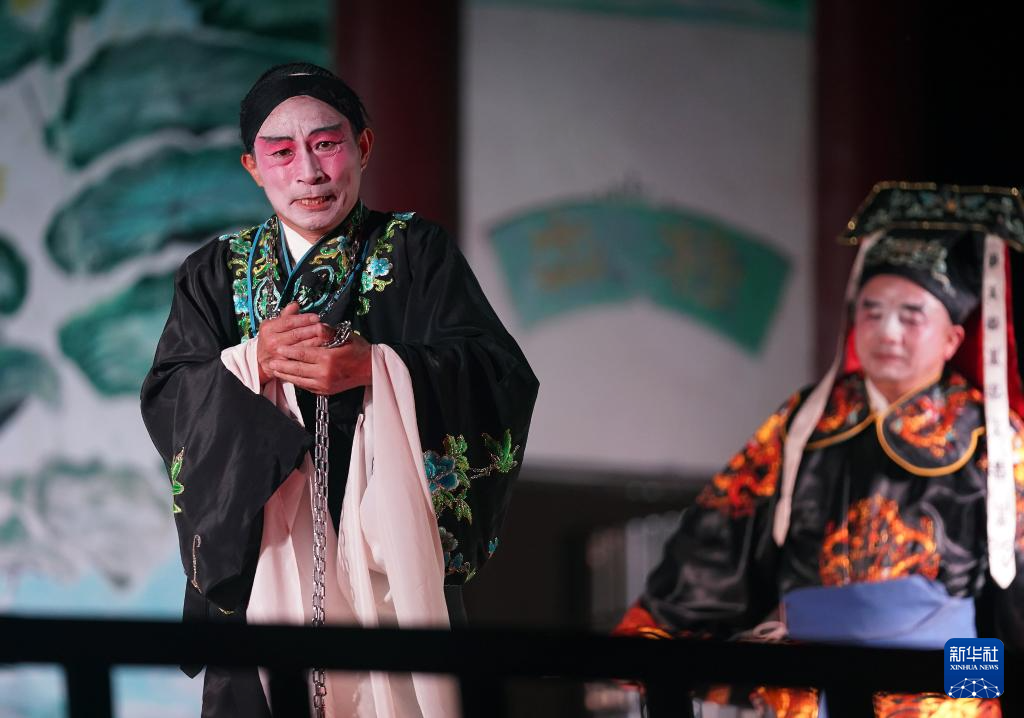 在广昌县头陂镇西港村,剧团演员演出孟戏选段《送别》(5月10日摄)。