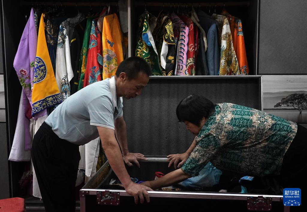 李安平(左)在整理戏服,准备前往广昌县头陂镇西港村演出(5月10日摄)。