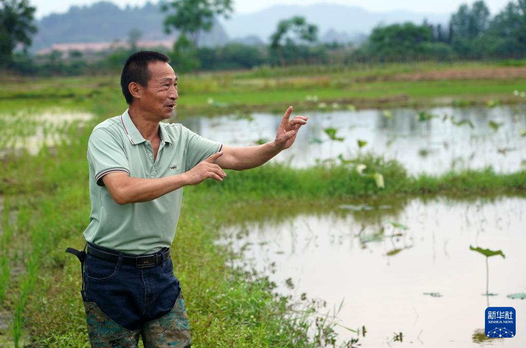 在广昌县甘竹镇甘竹村,李安平在荷塘边哼唱孟戏高腔(5月11日摄)。