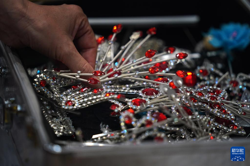 在广昌县甘竹镇的大路背孟戏剧团后台,演员化装时选用孟戏头饰(5月11日摄)。