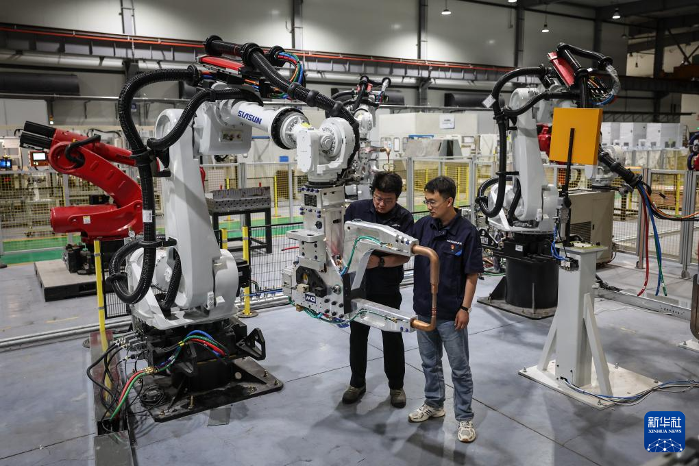 那鹏(右)和同事在测试验证为点焊机器人新开发的功能(6月3日摄)。新华社记者 潘昱龙 摄pagebreak