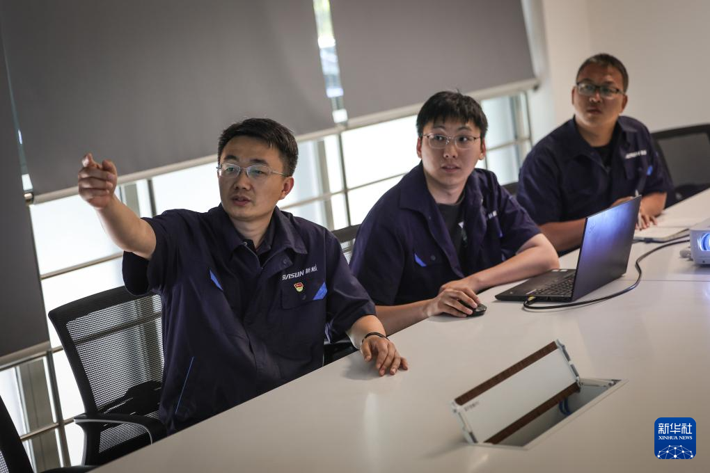 那鹏(右)和同事在讨论智能焊接机器人平台焊接方案(6月3日摄)。新华社记者 潘昱龙 摄pagebreak