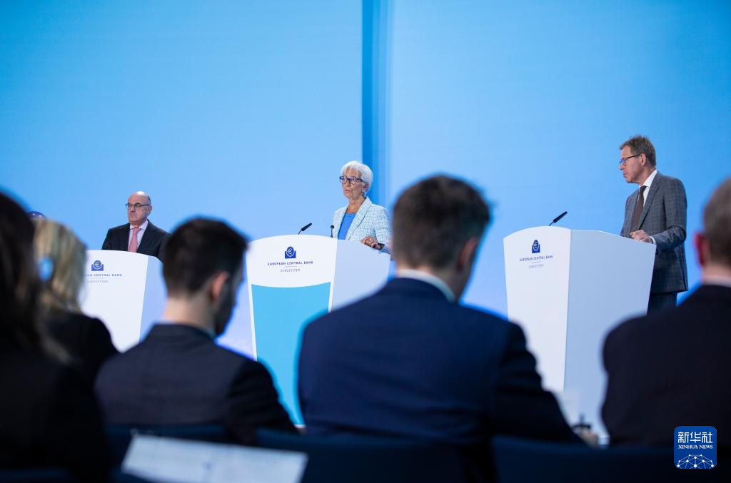 6月6日,欧洲中央银行行长拉加德(中)在德国法兰克福欧洲中央银行总部举行的新闻发布会上讲话。