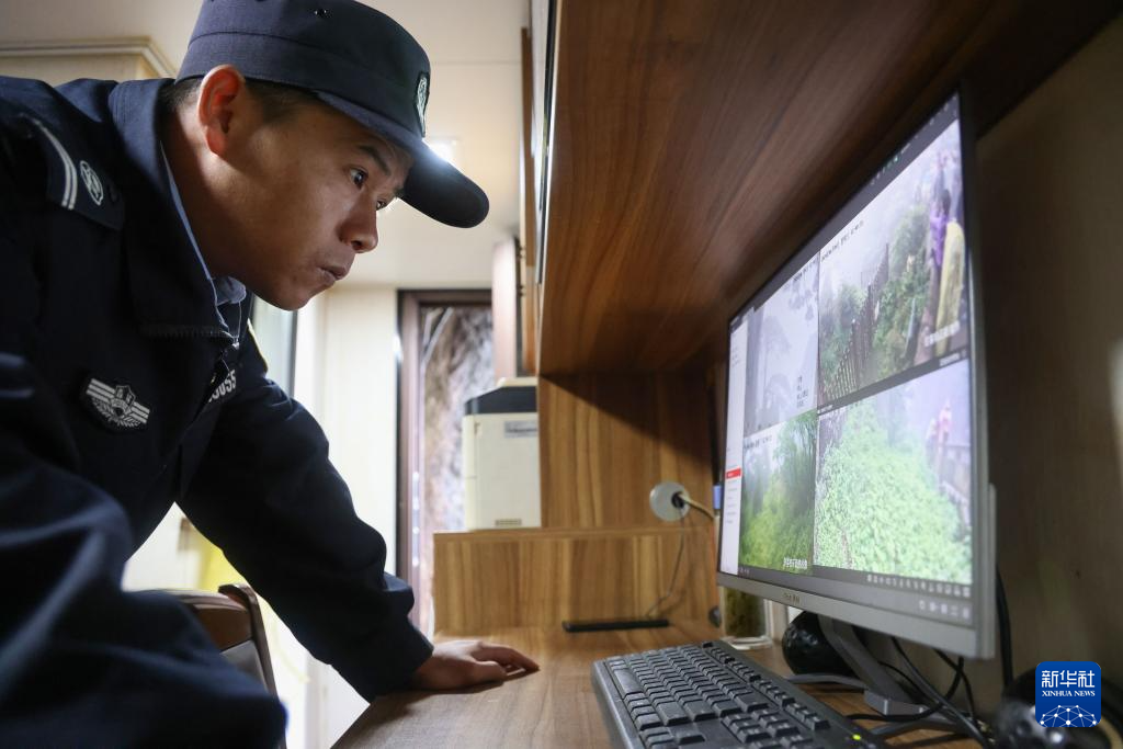 6月4日,“守松人”丁丁通过监控查看迎客松的情况。