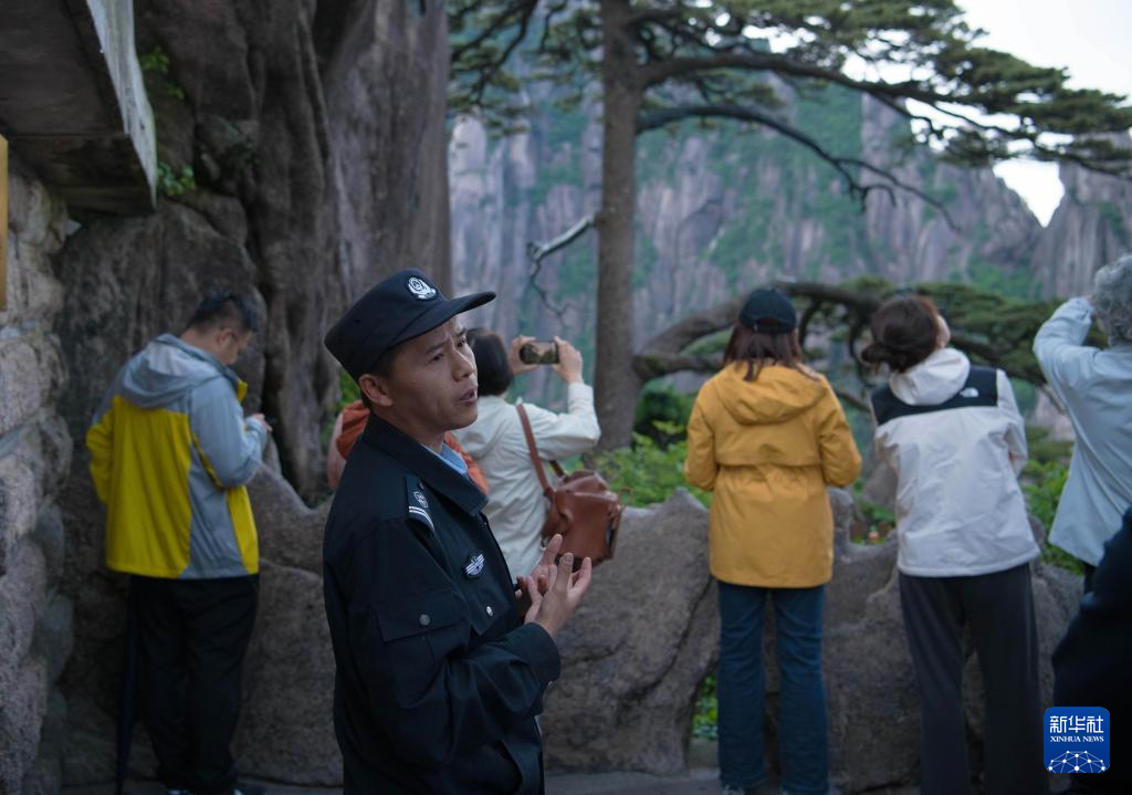 6月4日,“守松人”丁丁在给游客介绍迎客松的故事。