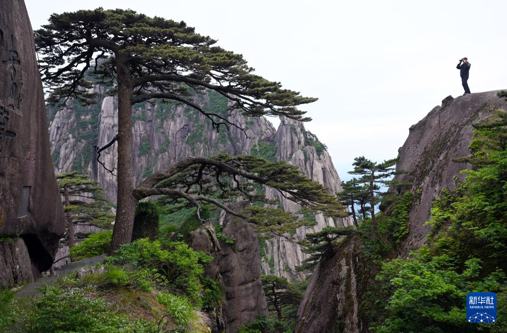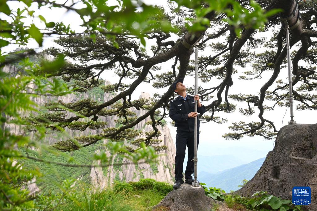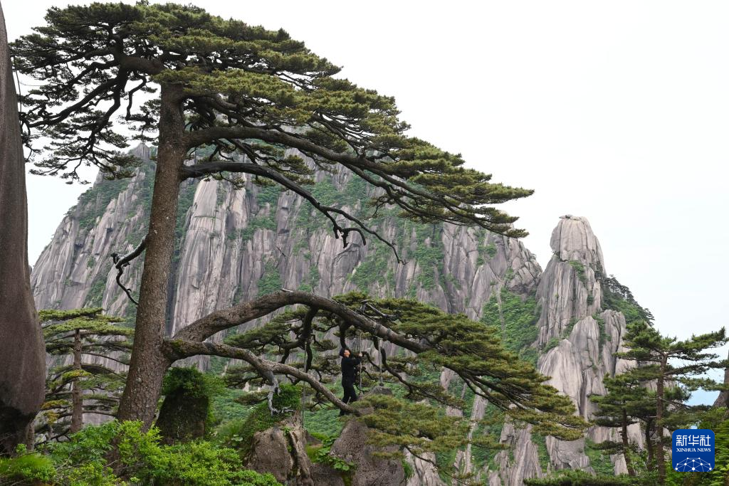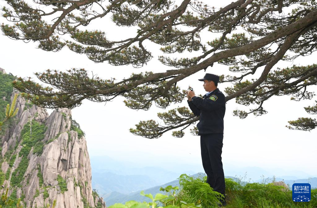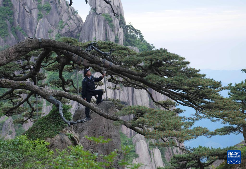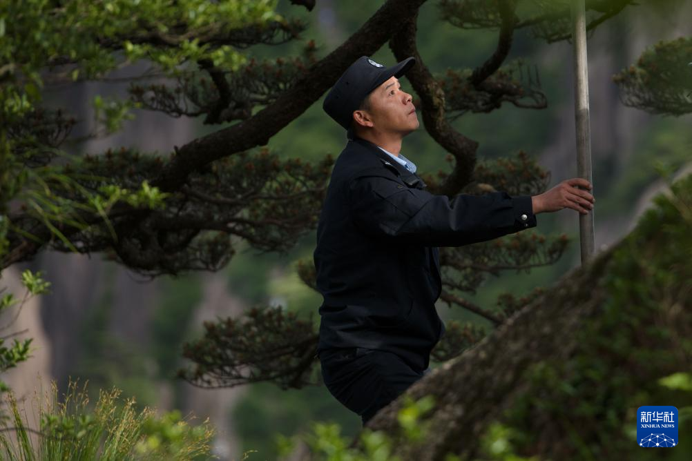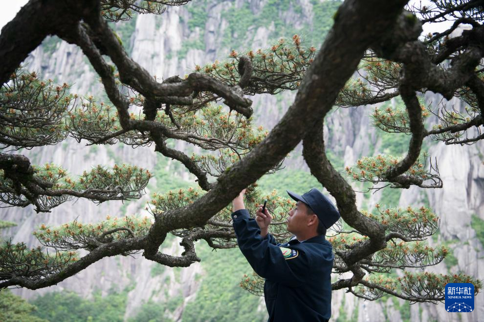 6月4日,“守松人”丁丁在对迎客松进行巡查。