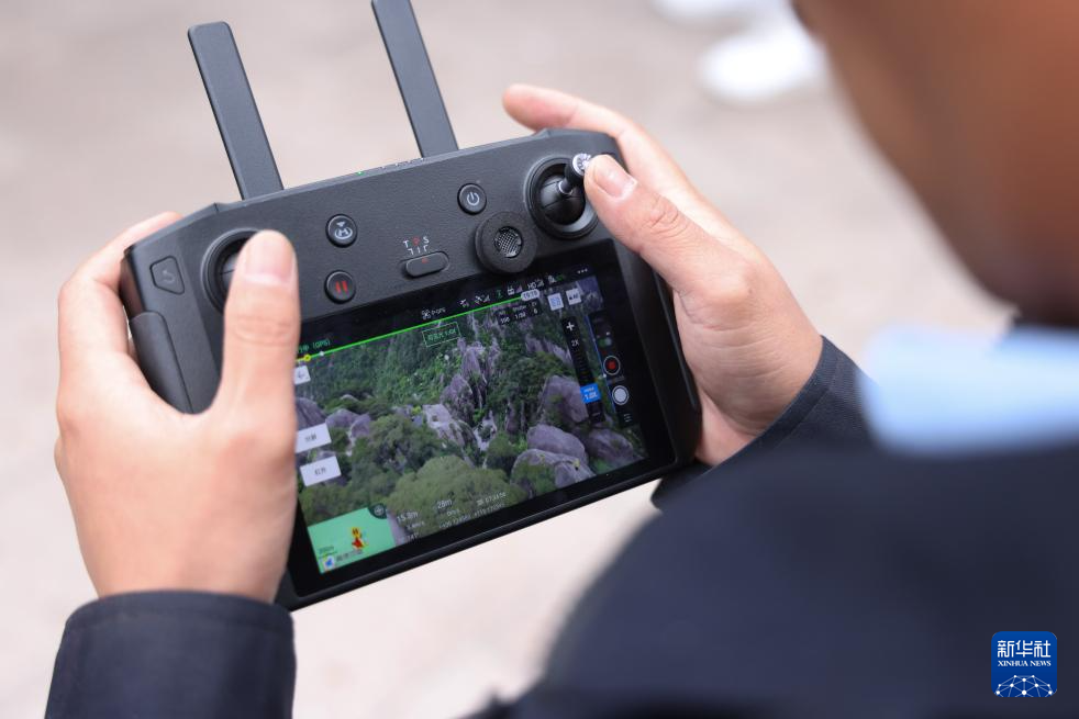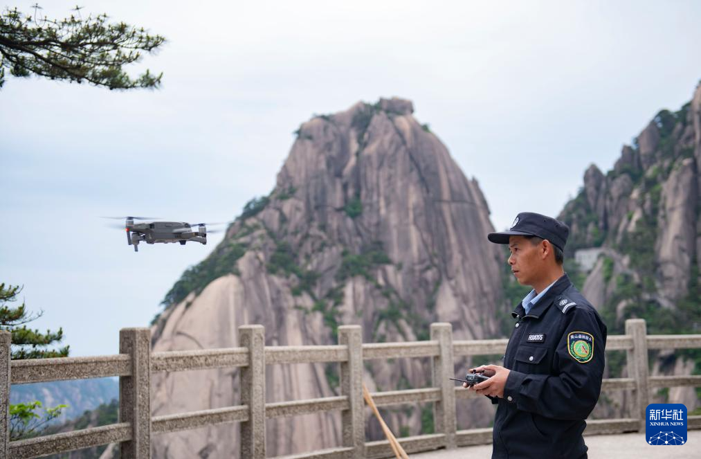 6月4日,“守松人”丁丁使用无人机对迎客松周边环境进行巡查。