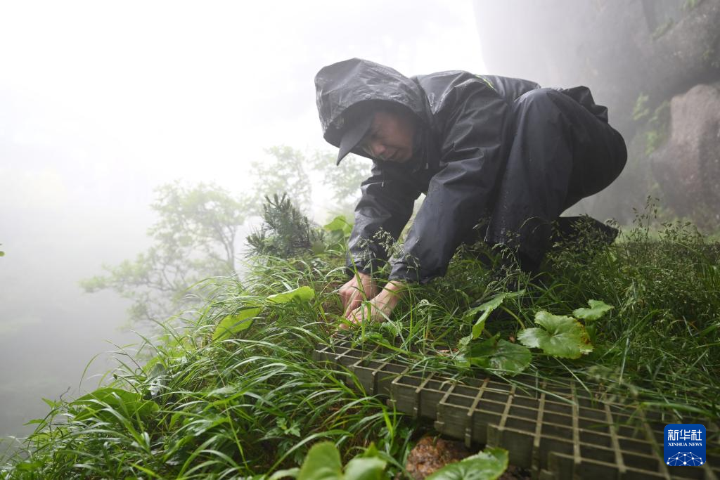 6月5日,“守松人”丁丁在雨天检查迎客松附近的地面,防止出现积水。