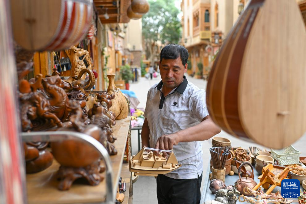 6月7日,在新疆和田市团城,商户在摆放木制品,准备营业。