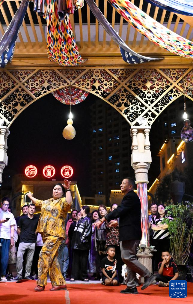 6月6日,当地居民在新疆和田市团城内的小广场上跳舞。