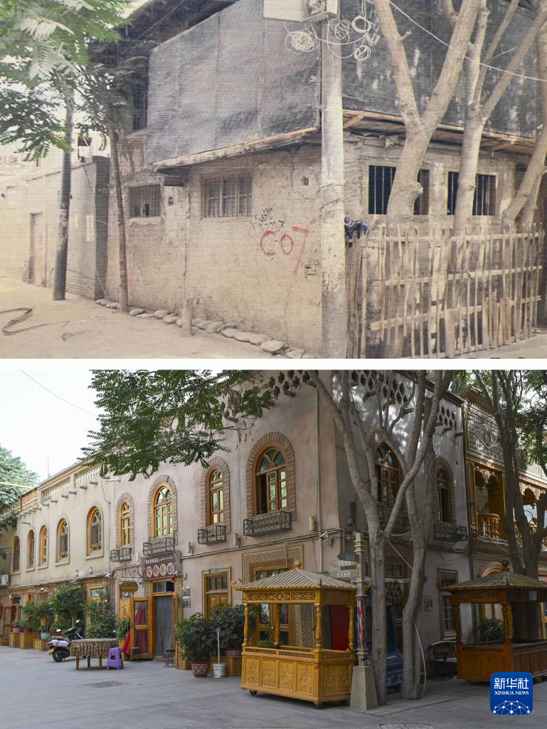 拼版照片:上图为新疆和田市团城2016年5月的一条街道外景(翻拍资料照片);下图为2024年6月7日在同一位置拍摄的改造后的团城街道外景。