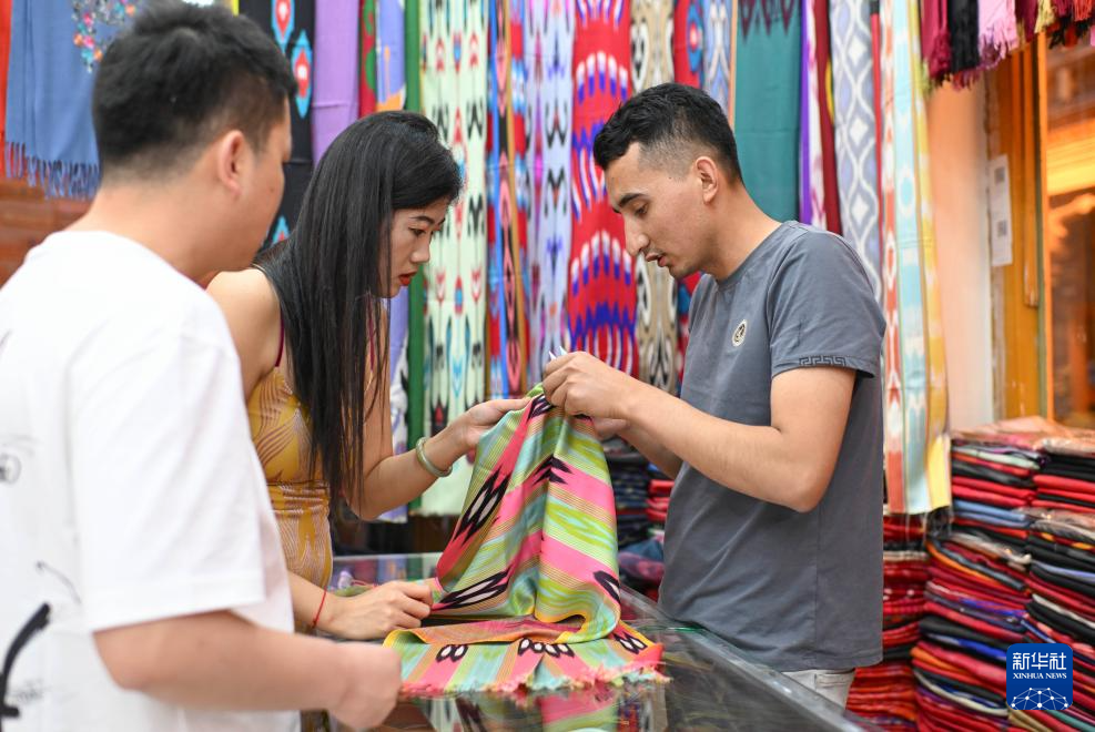 人们在新疆和田市团城的一家商铺选购艾德莱斯制品(6月6日摄)。