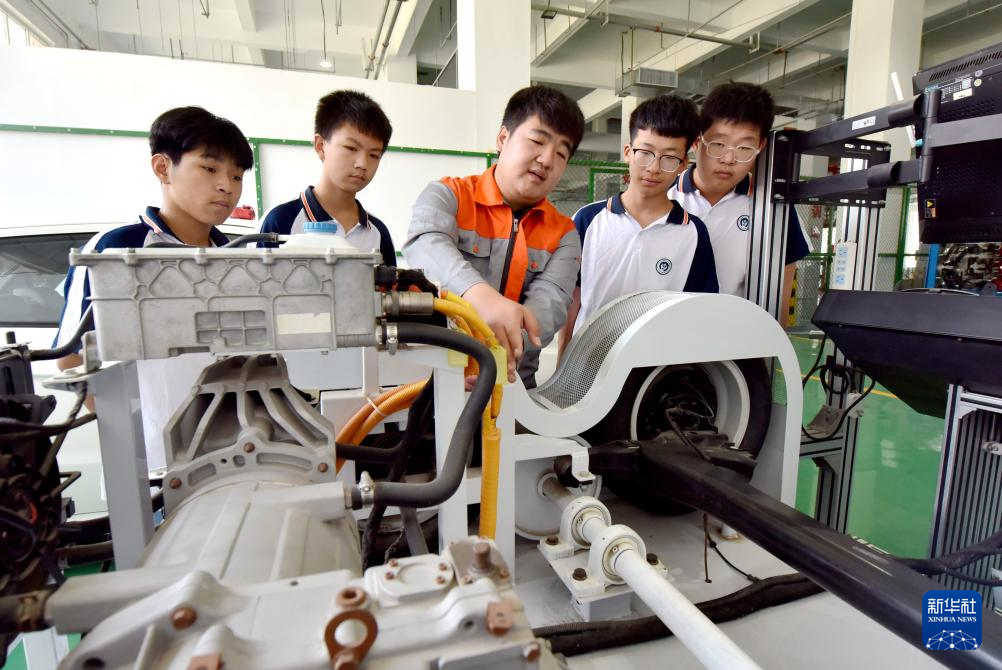 6月7日,威县职业技术教育中心教师为学生讲解电动汽车电机结构。