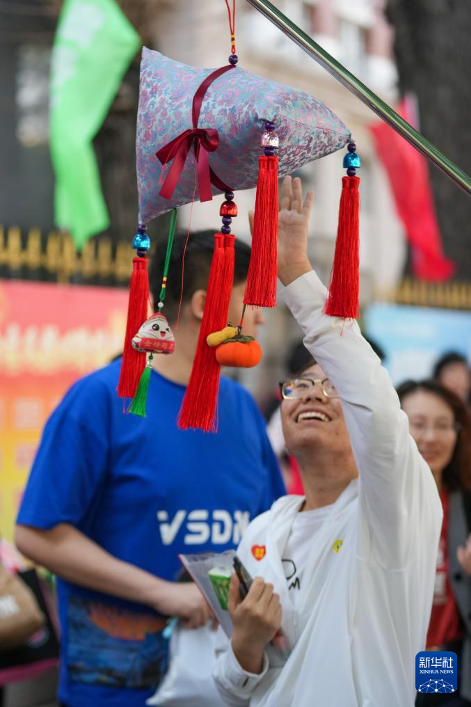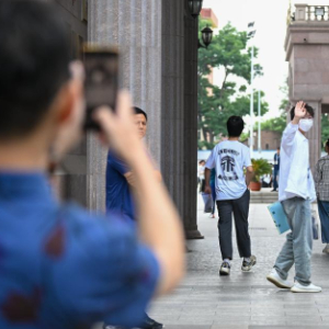 6月7日,在黑龙江哈尔滨市第九中学考点外,一名考生进入考场前伸手碰触“高粽”。