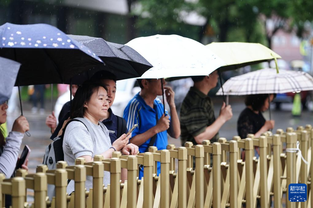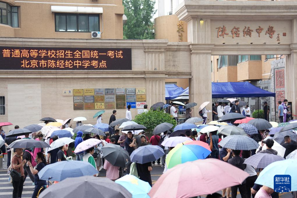 6月7日,送考家长在北京师范大学附属实验中学考点外目送考生进场。