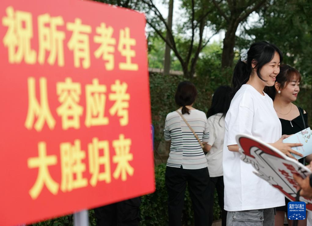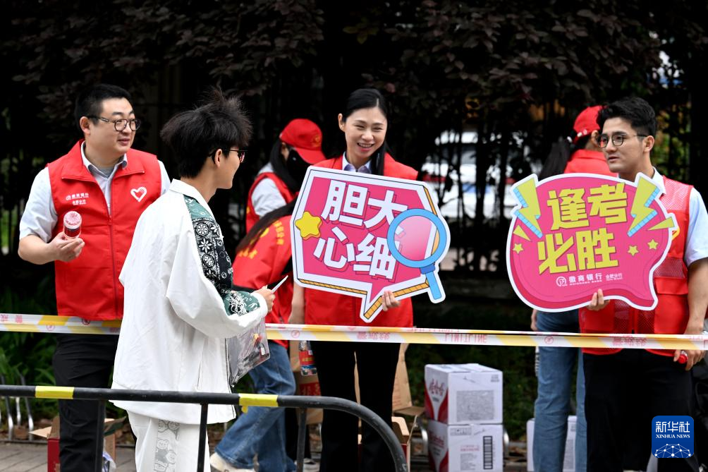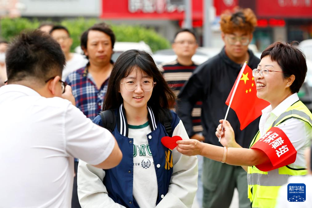 6月7日,在安徽合肥市五十中学天鹅湖教育集团天鹅湖校区考点,志愿者为考生加油。