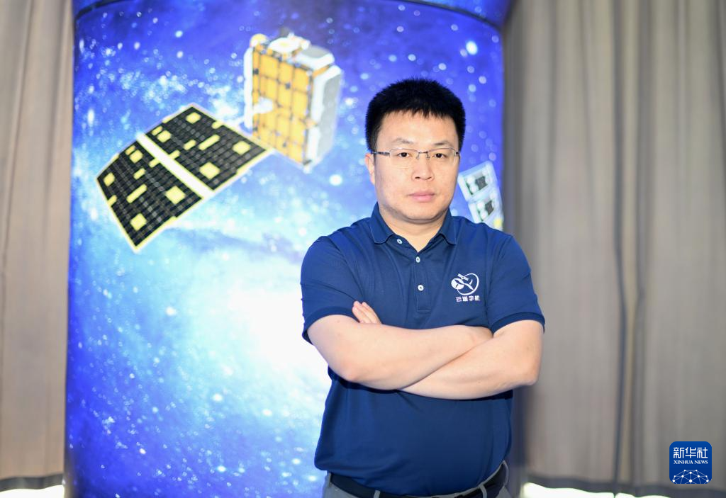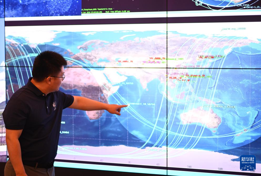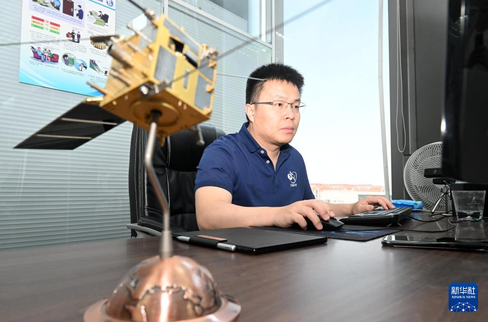 在云遥宇航的展厅内,李峰辉查看显示屏实时显示的卫星各项数据(6月4日摄)。
