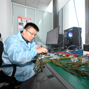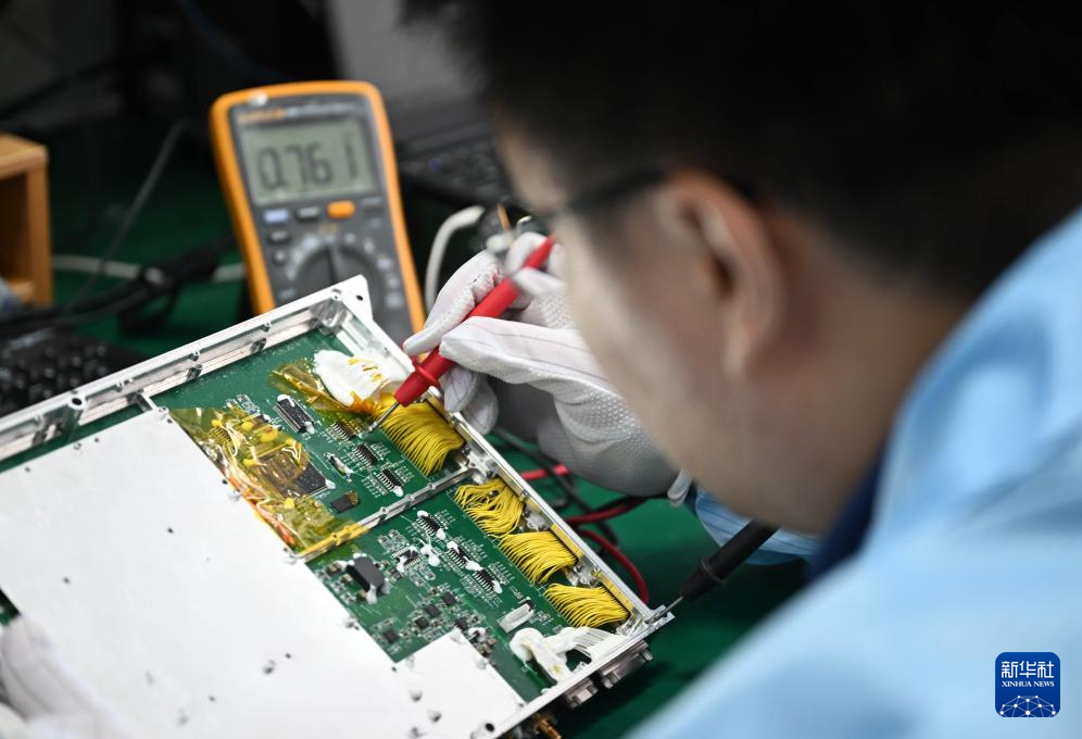 在云遥宇航的研发部,李峰辉测试一款卫星核心部件的集成电路板(6月4日摄)。