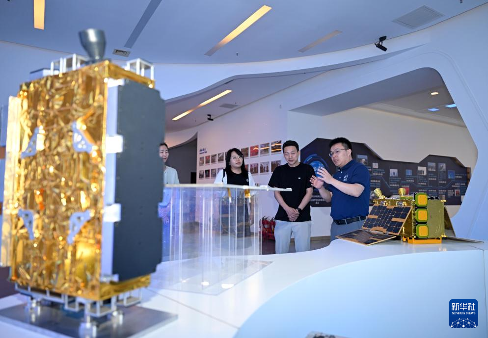 在云遥宇航的展厅内,李峰辉(右一)向前来参观的客户介绍公司卫星产品服务(6月4日摄)。