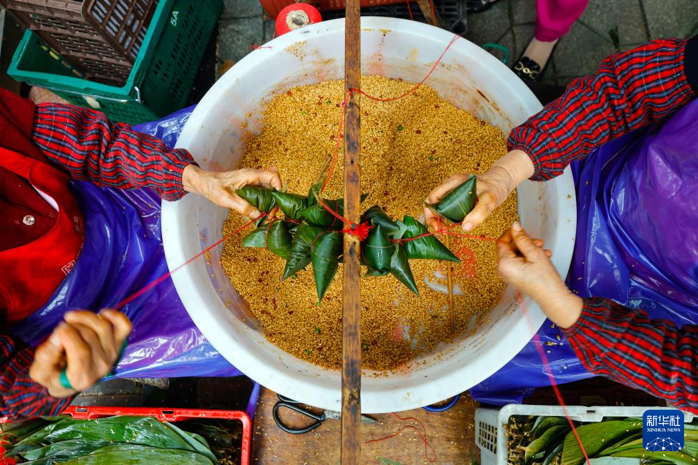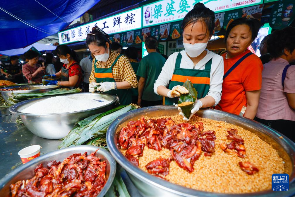 6月7日,在四川省成都市的“粽子一条街”上,一家粽子店的工作人员在包特色肉粽子。