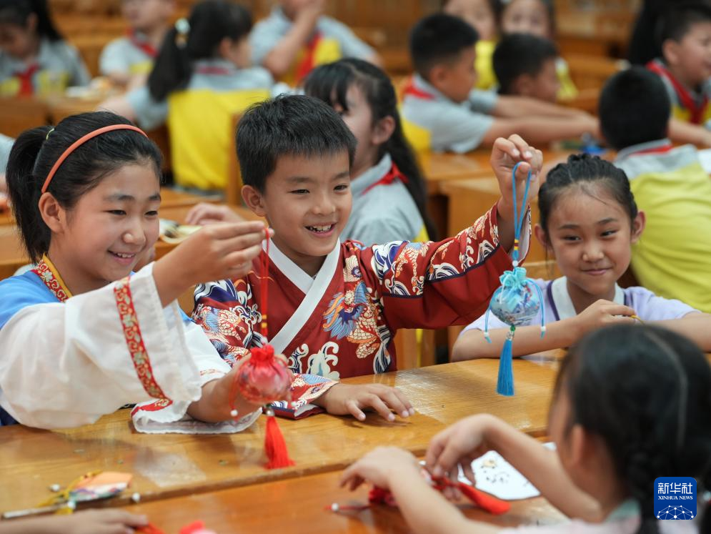 6月7日,河北省石家庄市联盟路小学学生在制作香囊。