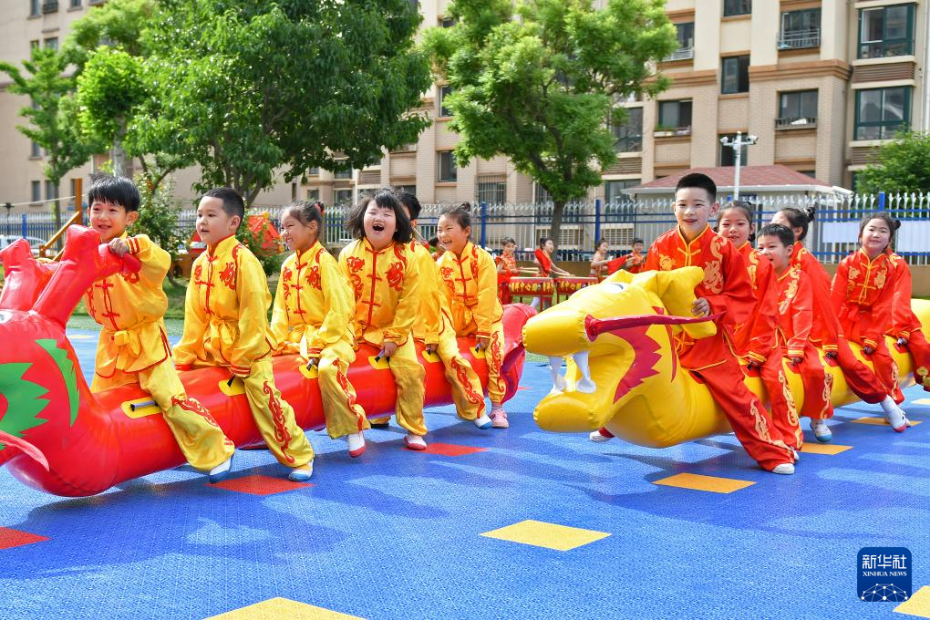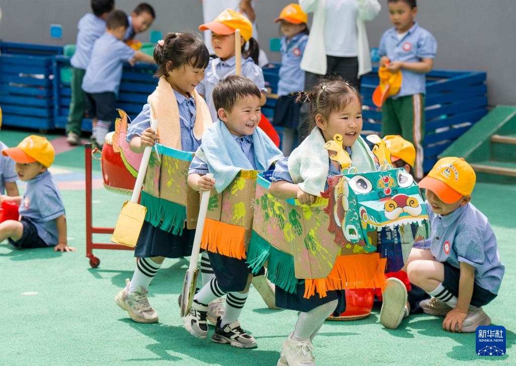 6月7日,山东省烟台市福山区清洋街道中心幼儿园的小朋友在进行旱地龙舟比赛。