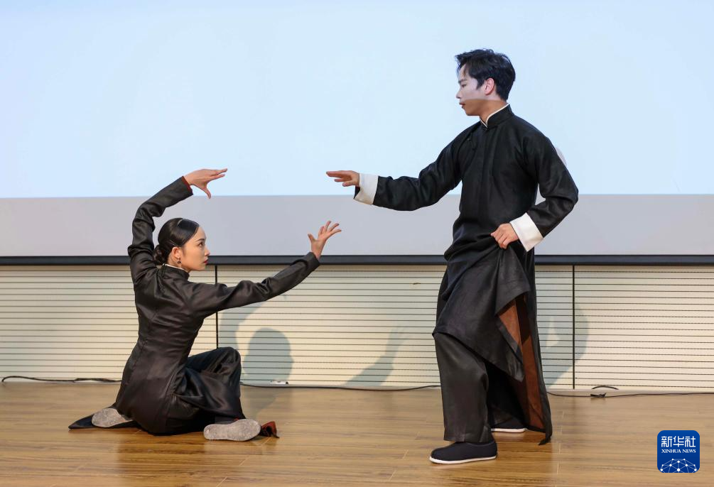 6月7日,来自深圳歌剧舞剧院的常宏基(右)和王沅琳在展示传统舞蹈和武术相融合的现代舞剧片段。