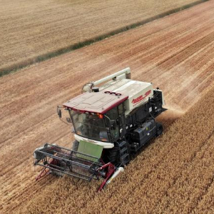 6月7日,收割机在河北省邢台市隆尧县固城镇东王村麦田里卸载收获的小麦(无人机照片)。