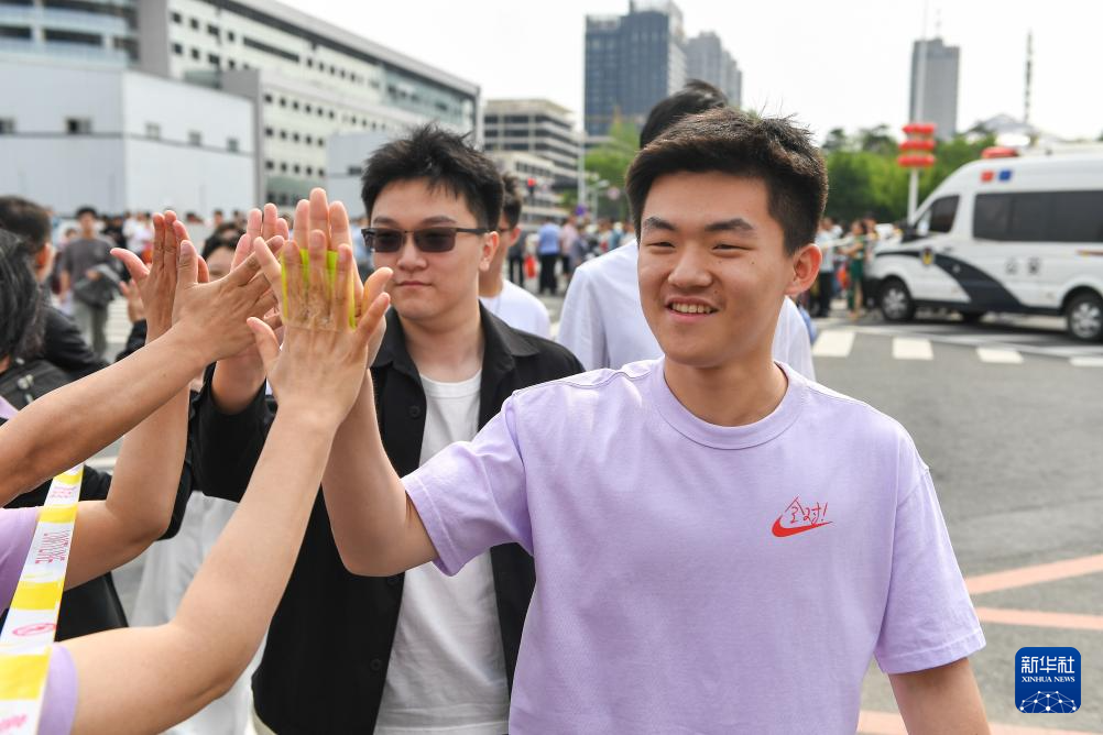 6月7日,考生在广东省广州市铁一中学考点与送考老师击掌。