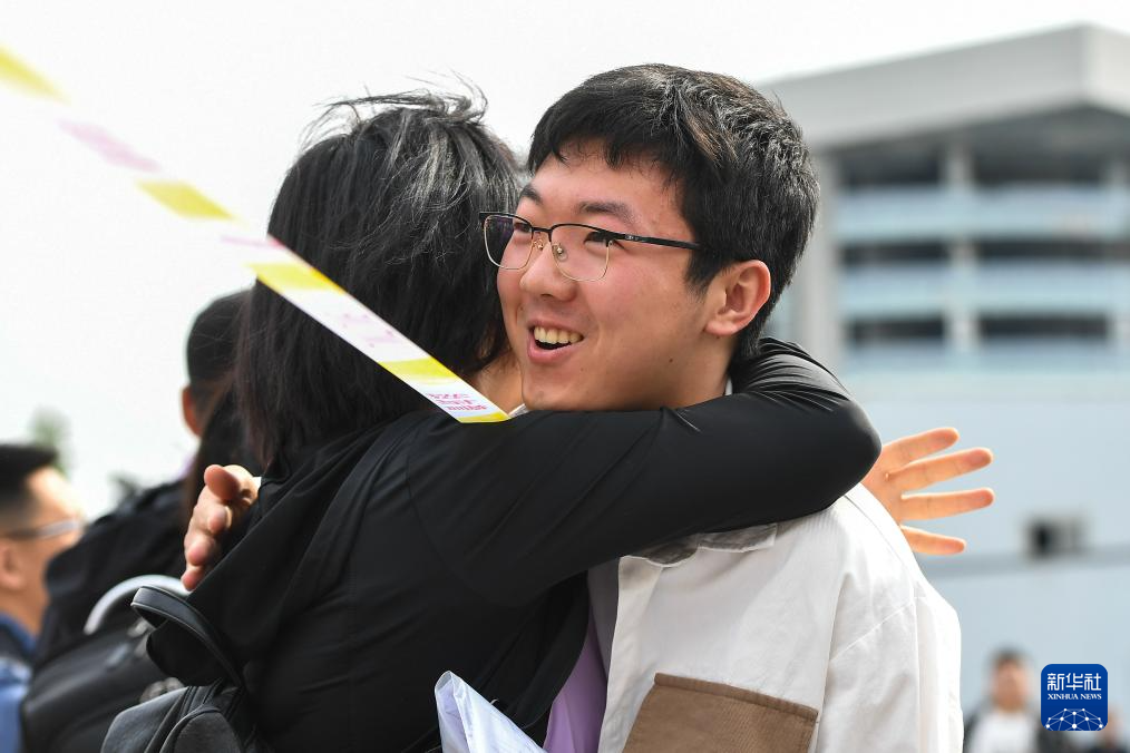 6月7日,在湖北省武汉市第十四中学考点,一名考生与送考家长拥抱。